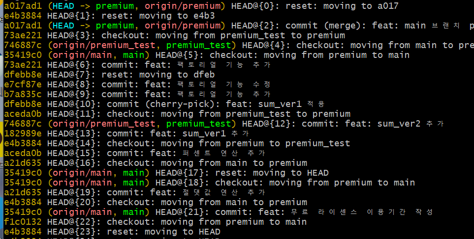 reset을 통해 이전 커밋으로 돌아가면 커밋이 log 내역에는 보이지는 않지만 reflog 시스템을 통하여 기록되어있다.