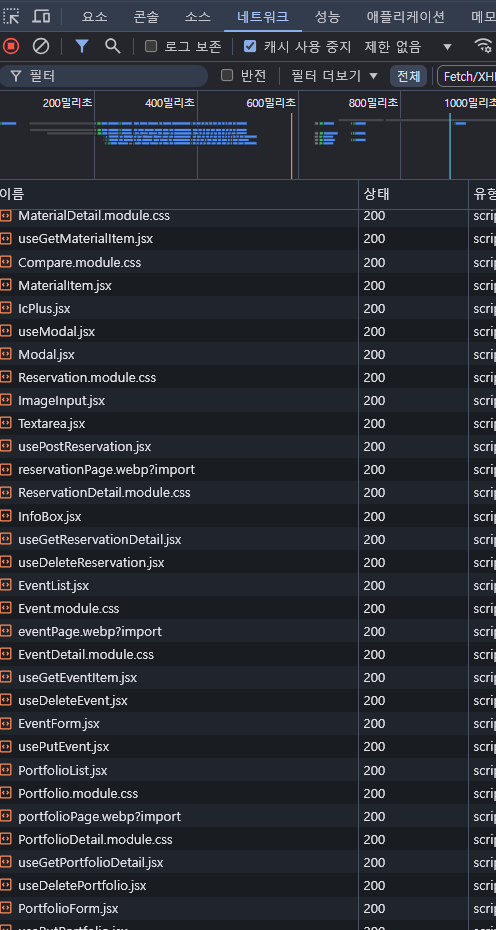 그리고 최대 1000밀리초까지 걸리던 로딩 시간이 약 500밀리초 후반까지 줄어든 모습도 확인할 수 있다.